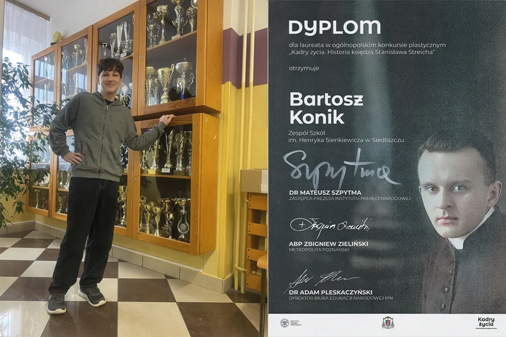 Z radością informujemy, że uczeń klasy 7c Bartosz Konik został Laureatem ogólnopolskiego konkursu „Kadry życia — historia księdza Stanisława Streicha”