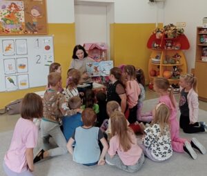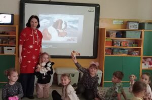 Bibliotekarka zachęciła również do przeczytania serii książek Barbary Gawryluk o psach pracujących np.: Morus – ratownik wodny, Czart – pies lawinowy, Badyl – pies policyjny, Luna – pies terapeuta. Następnie dzieci odgadywały zagadki i pokazywały jak można bawić się ze swoim podopiecznymi. Na zakończenie wykonały rysunek swojego czworonożnego przyjaciela.