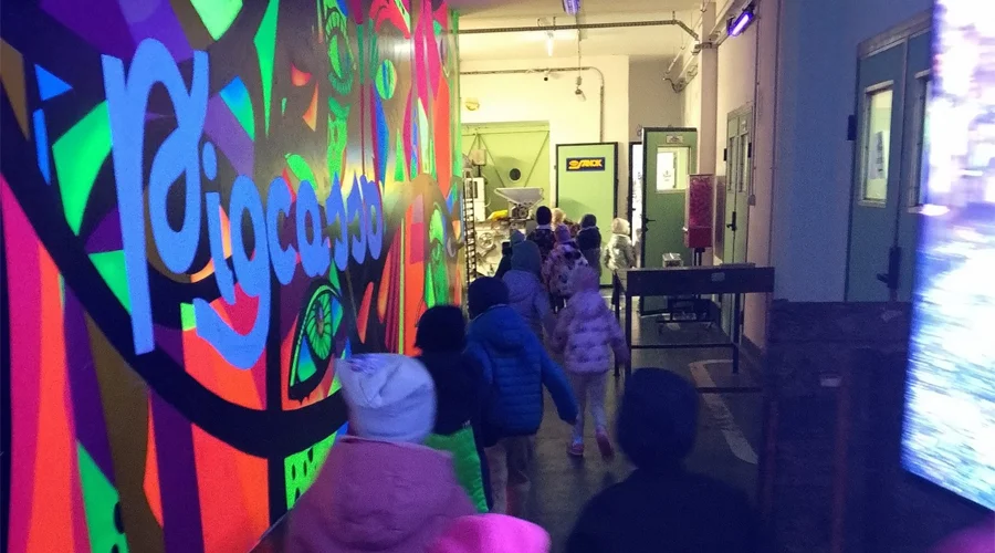 Dnia 10 kwietnia 2025r. wybraliśmy się na warsztaty plastyczne do centrum rozrywki Pigasso w Lublinie. Każdy przedszkolak stworzył własne dzieło sztuki, mając do dyspozycji farby oraz różnorodne akcesoria malarskie, takie jak pędzle, gąbki, strzykawki czy nawet własne ręce. Malowaniu i chlapaniu nie było końca. Po zgaszeniu światła obrazy zaświeciły w ciemności, gdyż częściowo zostały namalowane farbami fluorescencyjnymi. Obrazy można było potem podziwiać na szkolnym korytarzu, a po wystawie uczniowie zabrali je do swoich domów.