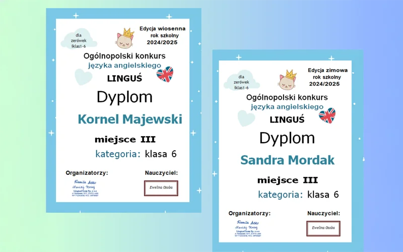 Serdecznie gratulujemy Sandrze i Kornelowi wspaniałych wyników oraz dziękujemy wszystkim uczniom za zaangażowanie i chęć rozwijania swoich kompetencji językowych.