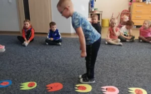 Przedszkolaki przyporządkowują liczby do odpowiedniej ilości danych przedmiotów na podłodze.